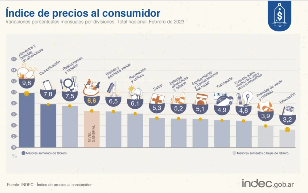 El índice de precios al consumidor (IPC) registró en febrero un incremento del 6,6% respecto al mes anterior, impulsado por el rubro alimentos y bebidas -en particular por el alza de la carne y huevos-, informó hoy el Instituto Nacional de Estadística y Censos (Indec).