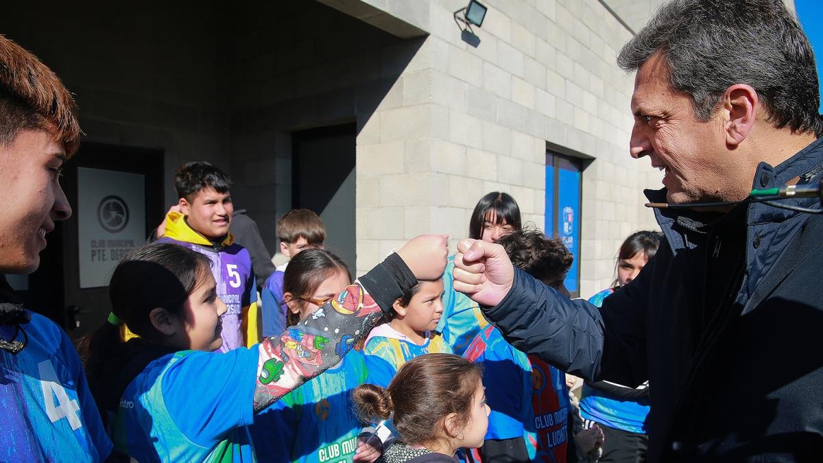 «Defendamos la Argentina del trabajo para poder pelear por una mejor puja distributiva», pidió Massa frente a los vecinos de la localidad de Presidente Derqui, en el acto de inauguración del Club Municipal Presidente Derqui «Lionel Messi», en Pilar, junto al ministro de Transporte bonaerense, Jorge D’Onofrio, y el intendente local, Federico Achával.