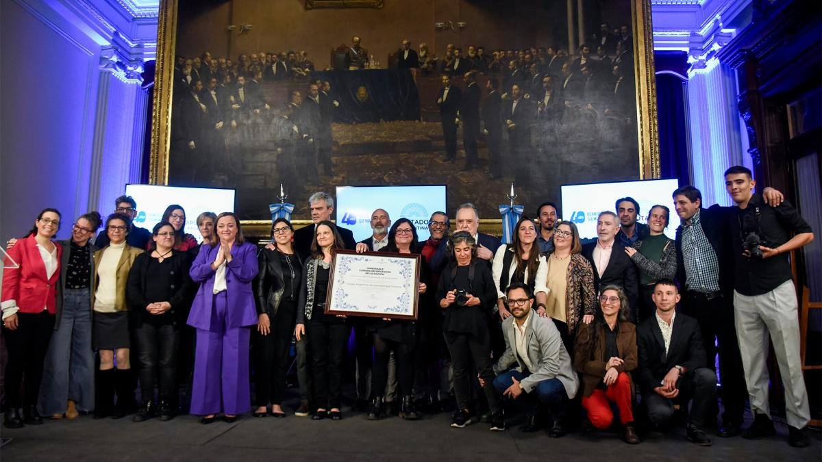 Tras entregar la distinción a Carlos «Maco» Somigliana – ‘por ser el más viejo del equipo’, según sus propias palabras-, todos los integrantes del EAAF subieron al estrado para inmortalizar la foto con el galardón otorgado por los legisladores.