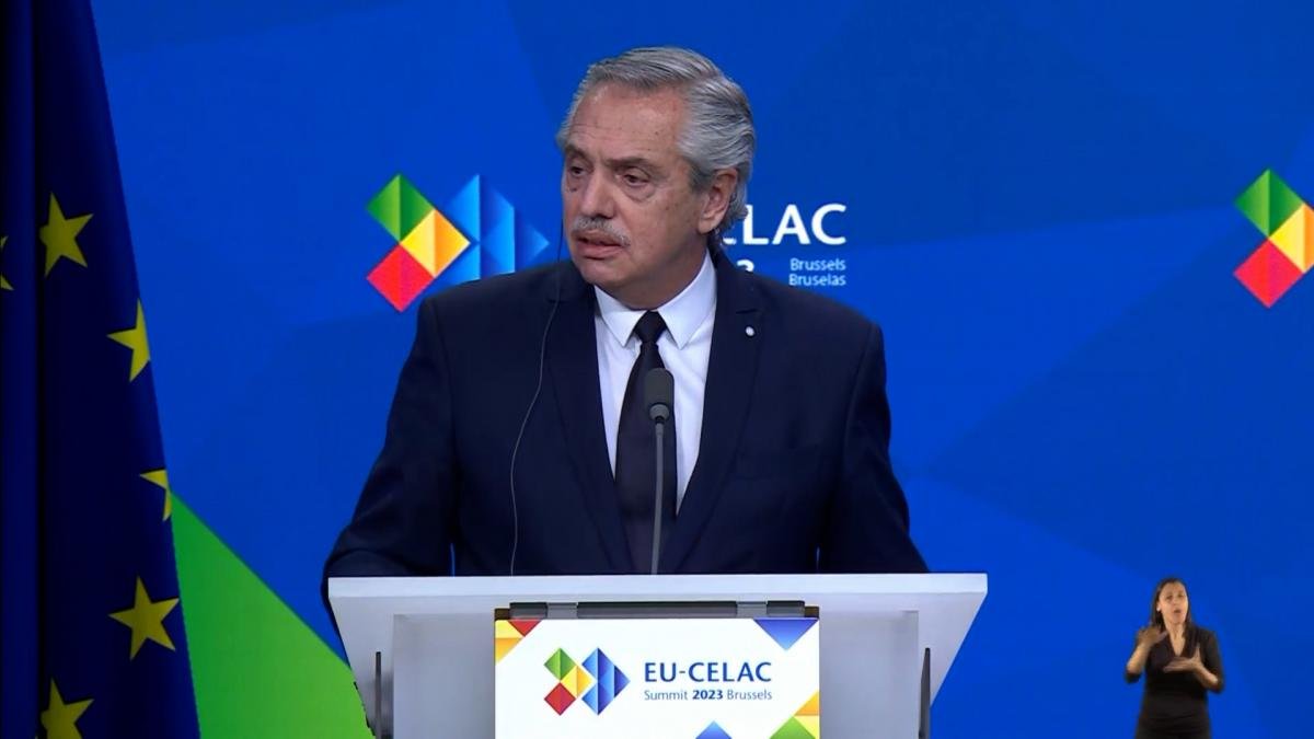 Más adelante, ante la requisitoria periodística sobre el tema, dejó en claro que «esta fue una cumbre entre la UE y la Celac para generar vínculos políticos, económicos y culturales, que ocurrió en un escenario donde hay una guerra desatada por Rusia, cuando invadió a Ucrania».