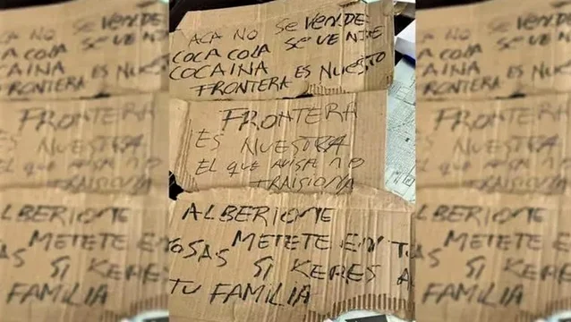 “Acá no se vende Coca Cola, se vende cocaína. Frontera es nuestra”, dice una de las intimidaciones, a las que se agregan las siguientes frases: “El que avisa no traiciona” y “Alberione metete en tus cosas si querés a tu familia”.