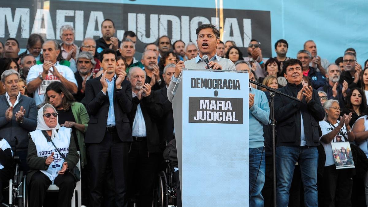 De esa manera, Kicillof se refirió a la concentración que se realizó este jueves frente al Palacio de Tribunales bajo el lema «Democracia o mafia judicial», en una convocatoria en la que se volvió a rechazar el intento de «proscripción» de la vicepresidenta Cristina Fernández de Kirchner.