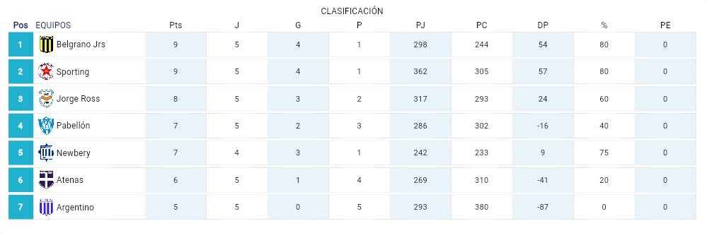 A falta de un encuentro pendiente entre Sporting y Newbery de Rufino (correspondiente a la fecha 1, suspendido por mal clima, que se juega este fin domingo), las posiciones quedaron de la siguiente manera: